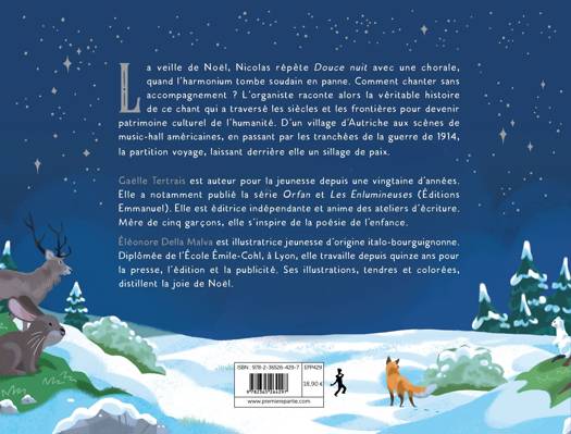 La veille de Noël, Nicolas répète Douce nuit avec une chorale, quand l‘harmonium tombe soudain en panne. Comment chanter sans accompagnement ? L‘organiste raconte alors la véritable histoire de ce chant qui a traversé les siècles et les frontières pour devenir patrimoine culturel de l‘humanité. D‘un village d‘Autriche aux scènes de music-hall américaines, en passant par les tranchées de la guerre de 1914, la partition voyage, laissant derrière elle un sillage de paix. Gaëlle Tertrais est auteur pour la jeunesse depuis une vingtaine d‘années. Elle a notamment publié la série Orfan et Les Enlumineuses (Éditions Emmanuel). Elle est éditrice indépendante et anime des ateliers d‘écriture. Mère de cinq garçons, elle s‘inspire de la poésie de l‘enfance. Éléonore Della Malva est illustratrice jeunesse d‘origine italo-bourguignonne. Diplômée de l‘École Émile-Cohl, à Lyon, elle travaille depuis quinze ans pour la presse, l‘édition et la publicité.