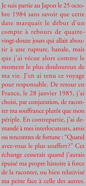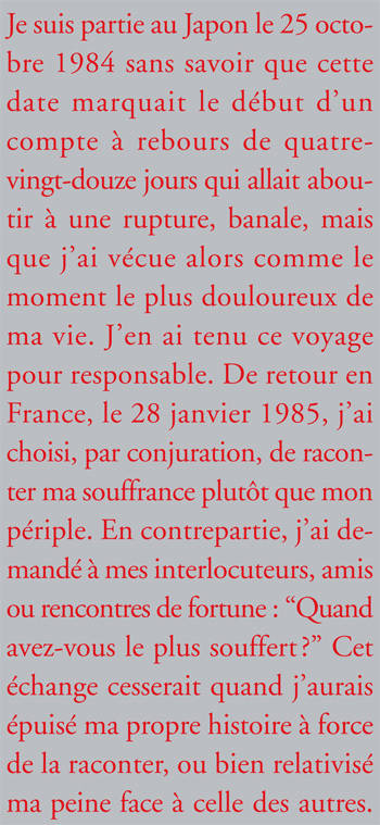 Je suis partie du Japon le 25 octobre 1984 sans savoir que cette date marquerait le début d'un compte à rebours de quatre-vingt-douze jours qui allait aboutir à une rupture, banale, mais que j'avais vécue alors comme le moment le plus douloureux de ma vie. J'ai tenu ce voyage pour responsable. De retour en France, le 28 janvier 1985, j'ai choisi, par conjuration, de raconter ma souffrance plutôt que mon périple. En contrepartie, j'ai demandé à mes interlocuteurs, amis ou rencontres de fortune : « Quand avez-vous le plus souffert ? » Cet échange cesserait quand j'aurais épuisé ma propre histoire à force de la raconter, ou bien relativisé ma peine face à celle des autres.