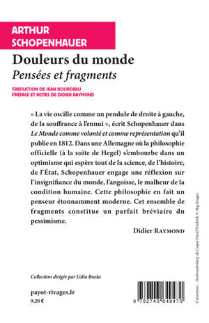 "La vie oscille comme un pendule de droite à gauche, de la souffrance à l'ennui", écrit Schopenhauer en 1812. Dans une Allemagne où la philosophie officielle, à la suite de Hegel, s'embourbe dans un optimisme qui espère tout de la science, de l'histoire, de l'État, Schopenhauer engage une réflexion sur l'insignifiance du monde, l'angoisse, le malheur de la condition humaine. Cette philosophie en fait un penseur étonnamment moderne. Cet ensemble de fragments, réuni par Jean Bourdeau, constitue un parfait bréviaire du nihilisme.