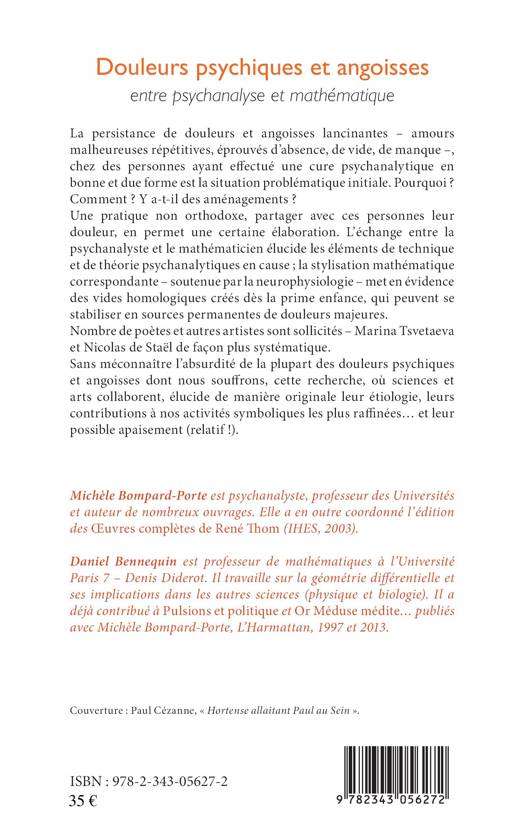 Que sont les douleurs et angoisses qui persistent après une cure psychanalytique ? Les partager est une pratique psychothérapeutique qui les élabore. Une psychanalyste et un mathématicien décrivent des vides homologiques créés dès la prime enfance, sources de douleurs majeures. Des artistes sont sollicités, dont Marina Tsvetaeva et Nicolas de Staël. L'étiologie, la neurophysiologie, la dynamique, la créativité, l'absurdité et la gravité des angoisses et douleurs précoces sont étudiées et leur possible apaisement (relatif !).