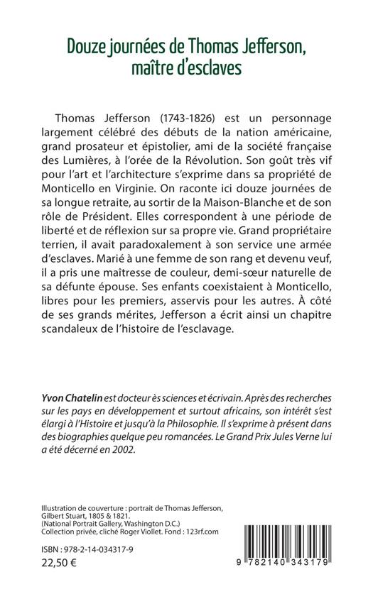 Thomas Jefferson (1743-1826) est un personnage largement célébré des débuts de la nation américaine, grand prosateur et épistolier, ami de la société française des Lumières, à l'orée de la Révolution. Son goût très vif pour l'art et l'architecture s'exprime dans sa propriété de Monticello en Virginie. On raconte ici douze journées de sa longue retraite, au sortir de la Maison-Blanche et de son rôle de Président. Elles correspondent à une période de liberté et de réflexion sur sa propre vie. Grand propriétaire terrien, il avait paradoxalement à son service une armée d'esclaves. Marié à une femme de son rang et devenu veuf, il a pris une maîtresse de couleur, demi-soeur naturelle de sa défunte épouse. Ses enfants coexistaient à Monticello, libres pour les premiers, asservis pour les autres. À côté de ses grands mérites, Jefferson a écrit ainsi un chapitre scandaleux de l'histoire de l esclavage.