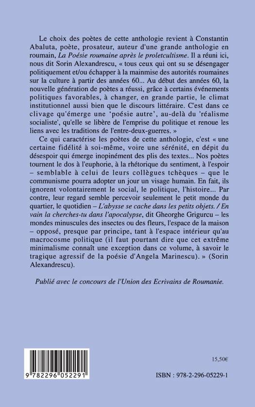 Le choix des poètes de cette anthologie revient à Constantin Abaluta, poète, prosateur, auteur d'une grande anthologie en roumain, La Poésie roumaine après le proletcultisme. Les poètes de cette anthologie font preuve d'une fidélité à soi-même, en dépit du désespoir qui émerge de leurs textes. Leur regard semble percevoir le petit monde du quartier, le quotidien, opposé au macrocosme politique.