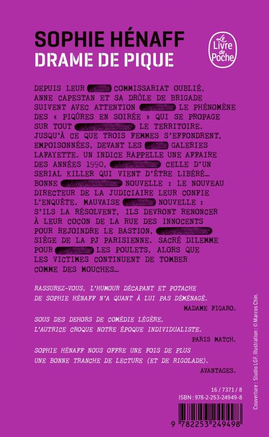 Depuis leur commissariat oublié, Anne Capestan et sa drôle de brigade suivent avec attention le phénomène des « piqûres en soirée » qui se propage sur tout le territoire. Jusqu’à ce que trois femmes s’effondrent, empoisonnées, devant les Galeries Lafayette. Un indice rappelle une affaire des années 1990, celle d’un serial killer qui vient d’être libéré… Bonne nouvelle : le nouveau directeur de la judiciaire leur confie l’enquête. Mauvaise nouvelle : s’ils la résolvent, ils devront renoncer à leur cocon de la rue des Innocents pour rejoindre le Bastion, siège de la PJ parisienne. Sacré dilemme pour les Poulets, alors que les victimes continuent de tomber comme des mouches…