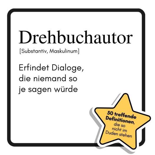 Wer wissen will, wie aus einem leeren Blatt Papier ein Blockbuster entsteht - und warum dabei Dialoge entstehen, die im echten Leben niemand je sagen würde - findet in "Drehbuchautor: Erfindet Dialoge, die niemand so je sagen würde" die Antwort. Dieses Buch nimmt die Welt des Drehbuchschreibens mit 50 witzigen Definitionen und Illustrationen aufs Korn und zeigt, wie absurd, kreativ und manchmal herrlich übertrieben das Handwerk wirklich ist.Für wen dieses Buch perfekt ist:- Für Filmfans, die wissen wollen, was hinter den Kulissen wirklich passiert- Für angehende Drehbuchautoren mit Sinn für Humor- Für alle, die über Hollywood-Klischees schmunzeln könnenVon Logline bis Table Read werden die wichtigsten Begriffe des Screenwritings humorvoll erklärt und illustriert. Ein Geschenk für alle, die Filme lieben, schreiben oder einfach gern lachen.Was dieses Buch bietet:- 50 lustige Definitionen rund ums Drehbuchschreiben- Passende Illustrationen zu jedem Begriff- Satirischer Blick auf die Filmbranche- Ideales Geschenk für Film- und Serienfans