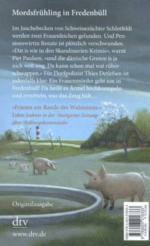 »Moin Moin, wo is denn hier die Leiche?« »Dat is ne Riesensauerei. Ihr müsst euch Gummisachen mitbringen. Unbedingt.« Große Aufregung in dem sonst so verschlafenen nordfriesischen Örtchen Fredenbüll: Im Jauchebecken des Schweinezüchters Schlotfeldt tauchen die Leichen zweier vermisster Frauen auf.Pensionswirtin Renate verschwindet - und findet sich angekettet in einem Kellerverlies wieder. Für Dorfpolizist Thies Detlefsen ist klar: Ein wahnsinniger Frauenmörder geht um! »Kein Wunder«, meintPiet Paulsen, »dat is wie in den Skandinavien-Krimis. Die dänische Grenze is ja nich weit weg.Da kann schon mal wat rüberschwappen... «