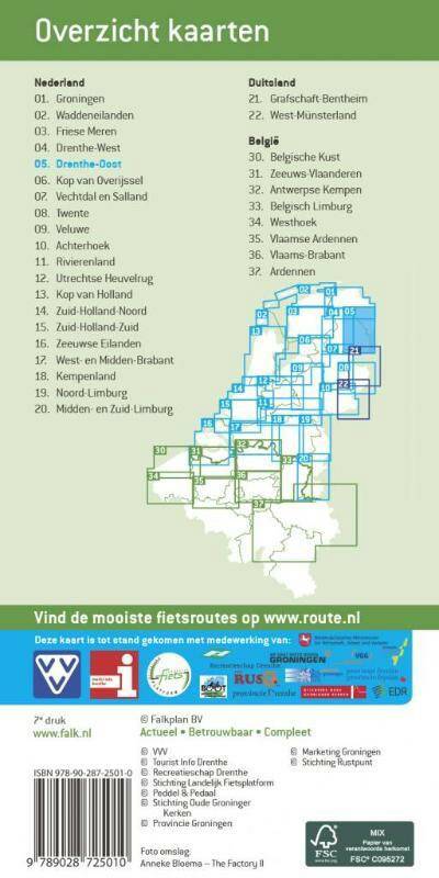 Geniet van het Nationaal beek- en esdorpenlandschap Drentsche Aa. Voortdurend kruisen de fietspaden de loop van de beek met pittoreske bruggen en oversteken. Geniet van het landschap dat er nog altijd uitziet zoals een eeuw geleden. Romantischer kan het haast niet! De fietskaart is voorzien knooppunten, het knooppuntennetwerk, LF-routes, plaats- en straatnamenregister, toeristische VVV-informatie, horecagelegenheden en een overzicht van alle VVV-kantoren in de regio. Ook de straatnamen in het buitengebied zijn aangegeven.