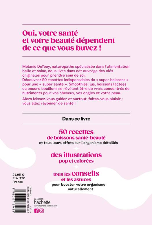 Mélanie Duféey, naturopathe spécialisée dans l’alimentation belle et saine, nous livre dans cet ouvrage des clés originales pour prendre soin de soi. Découvrez 50 recettes indispensables de « super boissons » pour une « super santé ». Smoothies, jus, boissons lactées ou encore bouillons se révèlent être de vrais concentrés de nutriments pour vos cheveux, vos ongles et votre peau. Alors laissez-vous guider et surtout, faites-vous plaisir : vous allez rayonner de santé !