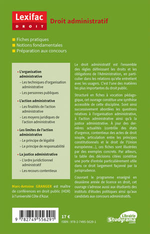 Structuré en fiches à vocation pédagogique, cet ouvrage constitue une synthèse accessible de cette discipline. Sont ainsi successivement abordées les questions relatives à l’organisation administrative, à l’action administrative ainsi qu’à la justice administrative. À jour des dernières actualités (contrôle des états d’urgence, contentieux des actes de droit souple, articulation entre les principes constitutionnels et le droit de l’Union européenne...), ces fiches sont illustrées par des exemples concrets. Par ailleurs, la table des décisions citées constitue une porte d’entrée particulièrement utile dans ce droit largement façonné par la jurisprudence.