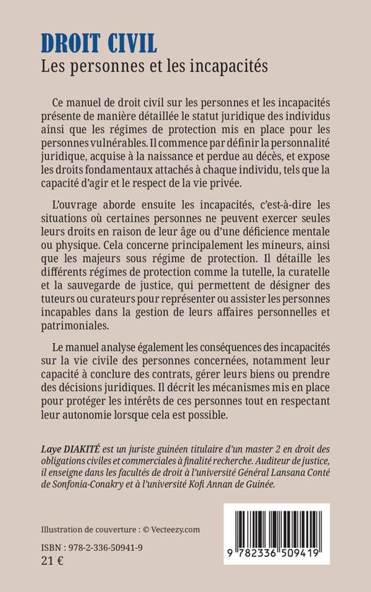 Ce manuel de droit civil sur les personnes et les incapacités présente de manière détaillée le statut juridique des individus ainsi que les régimes de protection mis en place pour les personnes vulnérables. Il commence par définir la personnalité juridique, acquise à la naissance et perdue au décès, et expose les droits fondamentaux attachés à chaque individu, tels que la capacité d'agir et le respect de la vie privée. L'ouvrage aborde ensuite les incapacités, c'est-à-dire les situations où certaines personnes ne peuvent exercer seules leurs droits en raison de leur âge ou d'une déficience mentale ou physique. Cela concerne principalement les mineurs, ainsi que les majeurs sous régime de protection. Il détaille les différents régimes de protection comme la tutelle, la curatelle et la sauvegarde de justice, qui permettent de désigner des tuteurs ou curateurs pour représenter ou assister les personnes incapables dans la gestion de leurs affaires personnelles et patrimoniales. Le manuel analyse également les conséquences des incapacités sur la vie civile des personnes concernées, notamment leur capacité à conclure des contrats, gérer leurs biens ou prendre des décisions juridiques. Il décrit les mécanismes mis en place pour protéger les intérêts de ces personnes tout en respectant leur autonomie lorsque cela est possible.