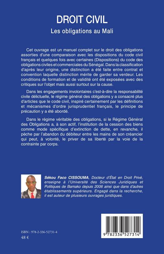 Cet ouvrage est un manuel complet sur le droit des obligations assorties d'une comparaison avec les dispositions du code civil français et quelques fois avec certaines (Dispositions) du code des obligations civiles et commerciales du Sénégal. Dans la classification d'après leur origine, une distinction a été faite entre contrat et convention laquelle distinction mérite de garder sa verdeur. Les conditions de formation et de validité ont été exposées avec des critiques sur l'objet mais aussi surtout sur la cause. Dans les engagements involontaires c'est-à-dire la responsabilité civile délictuelle, le régime général des obligations y a consacré plus d'articles que le code civil, inspiré certainement par les définitions et mécanismes d'ordre jurisprudentiel français, le principe de précaution y a été abordé. Dans le régime véritable des obligations, si le Régime Général des Obligations a, à son actif l'institution de la cession des biens comme mode spécifique d'extinction de dette, en revanche, il pèche par l'abandon du débiteur entre les mains de son créancier qui peut, à volonté le priver de sa liberté par la voie de la contrainte par corps.