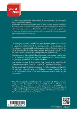 Dans la première partie sont abordées les règles et l’organisation de l’activité commerciale. La seconde partie traite du fonds de commerce, des opérations sur le fonds de commerce et des partenaires contractuels de l’entreprise commerciale.