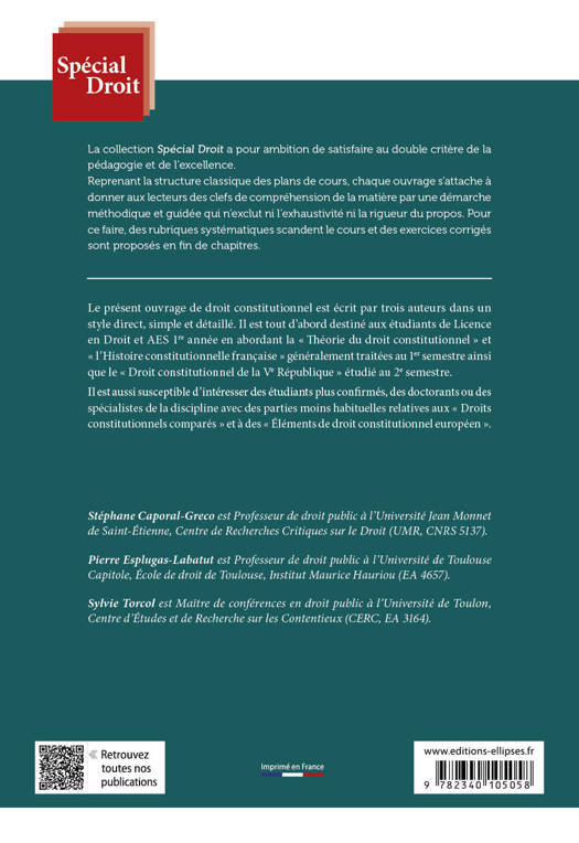Ce manuel est, avant tout, destiné aux étudiants de Licence en Droit et AES de 1re année en abordant la "Théorie du droit constitutionnel" et "l'Histoire constitutionnelle française" généralement traités au 1er semestre ainsi que le "Droit constitutionnel de la Ve République" étudié au 2e semestre. Néanmoins, il est aussi susceptible d'intéresser des étudiants plus confirmés, des doctorants ou des spécialistes de la discipline avec des parties moins habituelles relatives aux "Droits constitutionnels comparés" et à des "Éléments de droit constitutionnel européen ".