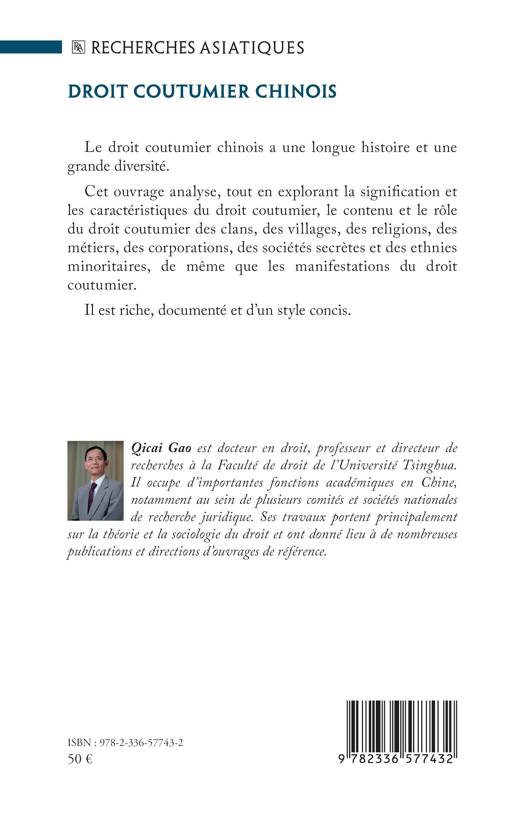Le droit coutumier chinois a une longue histoire et une grande diversité. Cet ouvrage analyse, tout en explorant la signification et les caractéristiques du droit coutumier, le contenu et le rôle du droit coutumier des clans, des villages, des religions, des métiers, des corporations, des sociétés secrètes et des ethnies minoritaires, de même que les manifestations du droit coutumier. Il est riche, documenté et d'un style concis.