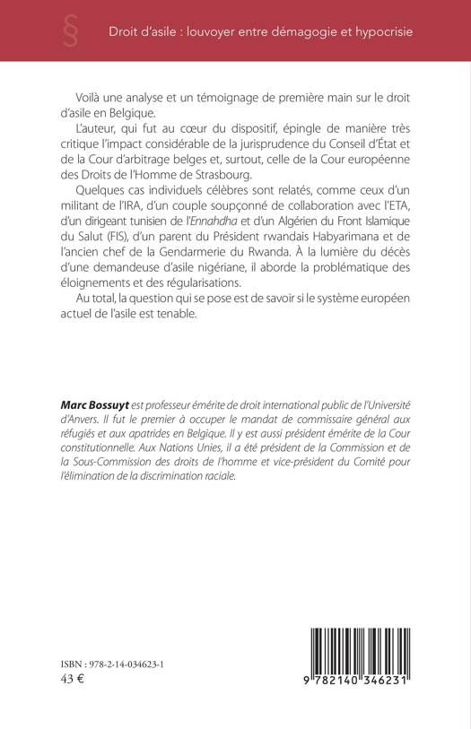 Voilà une analyse et un témoignage de première main sur le droit d’asile en Belgique. L’auteur, qui fut au cœur du dispositif, épingle de manière très critique l’impact considérable de la jurisprudence du Conseil d’État et de la Cour d’arbitrage belges et, surtout, celle de la Cour européenne des Droits de l’Homme de Strasbourg. Quelques cas individuels célèbres sont relatés, comme ceux d’un militant de l’IRA, d’un couple soupçonné de collaboration avec l’ETA, d’un dirigeant tunisien de l’Ennahdha et d’un Algérien du Front Islamique du Salut (FIS), d’un parent du Président rwandais Habyarimana et de l’ancien chef de la Gendarmerie du Rwanda. À la lumière du décès d'une demandeuse d'asile nigériane, il aborde la problématique des éloignements et des régularisations. Au total, la question qui se pose est de savoir si le système européen actuel de l’asile est tenable.