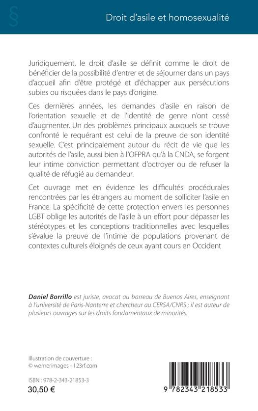 Juridiquement, le droit d’asile se définit comme le droit de bénéficier de la possibilité d’entrer et de séjourner dans un pays d’accueil afin d’être protégé et d’échapper aux persécutions subies ou risquées dans le pays d’origine. Ces dernières années, les demandes d’asile en raison de l’orientation sexuelle et de l’identité de genre n’ont cessé d’augmenter. Un des problèmes principaux auxquels se trouve confronté le requérant est celui de la preuve de son identité sexuelle. C’est principalement autour du récit de vie que les autorités de l’asile se forgent leur intime conviction. Cet ouvrage met en évidence les difficultés procédurales rencontrées par les étrangers au moment de solliciter l’asile en France. La spécificité de cette protection envers les personnes LGBT oblige les autorités de l’asile à un effort pour dépasser les stéréotypes et les conceptions traditionnelles d’évaluation.
