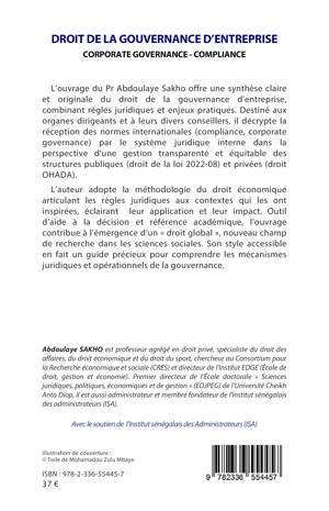 L'ouvrage du Pr Abdoulaye Sakho offre une synthèse claire et originale du droit de la gouvernance d'entreprise, combinant règles juridiques et enjeux pratiques. Destiné aux organes dirigeants et à leurs divers conseillers, il décrypte la réception des normes internationales (compliance, corporate governance) par le système juridique interne dans la perspective d'une gestion transparente et équitable des structures publiques (droit de la loi 2022-08) et privées (droit OHADA). L'auteur adopte la méthodologie du droit économique articulant les règles juridiques aux contextes qui les ont inspirées, éclairant leur application et leur impact. Outil d'aide à la décision et référence académique, l'ouvrage contribue à l'émergence d'un droit global, nouveau champ de recherche dans les sciences sociales. Son style accessible en fait un guide précieux pour comprendre les mécanismes juridiques et opérationnels de la gouvernance.