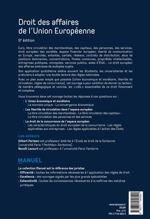 Avec un plan aussi simple que possible (Union économique et monétaire, libertés de circulation, règles de concurrence), cet ouvrage a pour ambition de donner au lecteur, de manière pédagogique et concise, les « clés » essentielles de ce droit foisonnant et complexe.