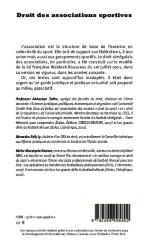 L'association est la structure de base de l'exercice en collectivité du sport. Elle sert de support aux fédérations, à leur union mais aussi aux groupements sportifs. Le droit sénégalais des associations a été construit sur le modèle de la loi française Waldeck-Rousseau du 1er juillet 1901, dans sa version en vigueur, dans les années 60. Or, ces textes sont aujourd'hui inadaptés. Il était donc urgent qu'un guide juridique et pratique actualisé soit proposé au milieu associatif.