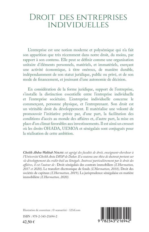 L'entreprise est une notion moderne et polysémique qui n'a fait son apparition que très récemment dans le droit sénégalais. L'entreprise individuelle concerne le commerçant, personne physique, et l'entreprenant. Son droit est un véritable droit du développement. Il matérialise une volonté de promouvoir l'initiative privée par, d'une part, la facilitation des conditions d'accès au monde des affaires et, d'autre part, la mise en place d'un climat favorables aux investissements. Il est ainsi un creuset où les droits OHADA, UEMOA et sénégalais sont conjugués pour la réalisation de cette ambition.