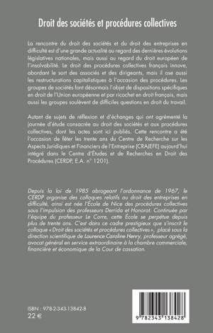 La rencontre du droit des sociétés et du droit des entreprises en difficulté est d'une grand actualité au regard des dernières évolutions législatives nationales, mais aussi du droit européen de l'insolvabilité. Le droit des procédures collectives français innove, abordant le sort des associés et des dirigeants, mais il ose aussi les restructurations capitalistiques à l'occasion des procédures. Les groupes de sociétés font désormais l'objet de dispositions spécifiques en droit de l'Union européenne et par ricochet en droit français, mais aussi les groupes de sociétés soulèvent de difficiles questions en droit du travail.