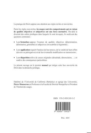 La pratique du Droit suppose une attention aux règles écrites et non-écrites. Parmi les règles non-écrites, les usages sont des comportements qui en raison de qualités objectives et subjectives ont une force normative. Par-delà la diversité des ordres juridiques dans lesquels ils sont invoqués, ils soulèvent des questions communes : - Leur formation suppose l'examen de qualités objectives (détermination, délimitation, généralité) et subjectives (invocabilité et légitimité) ; - Leur application requiert l'analyse de leur preuve, de la variété de leurs effets (devoirs ou prérogatives) et de leur éventuelle modification ou transmission ; - Leur disparition relève de causes originales (désuétude, dénonciation, ...) et soulève des conséquences particulières. Le présent ouvrage est le premier manuel qui intègre cette face non-écrite du Droit dans la démarche juridique.