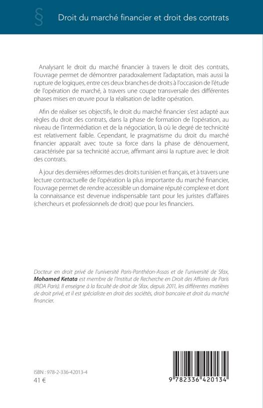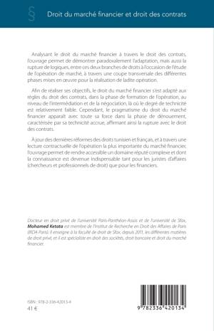 Analysant le droit du marché financier à travers le droit des contrats, l'ouvrage permet de démontrer paradoxalement l'adaptation, mais aussi la rupture de logiques, entre ces deux branches de droits à l'occasion de l'étude de l'opération de marché. Afin de réaliser ses objectifs, le droit du marché financier s'est adapté aux règles du droit des contrats, dans la phase de formation de l'opération, au niveau de l'intermédiation et de la négociation, là où le degré de technicité est relativement faible. Cependant, le pragmatisme du droit du marché financier apparaît avec toute sa force dans la phase de dénouement, caractérisée par sa technicité accrue, affirmant ainsi la rupture avec le droit des contrats. À jour des dernières réformes des droits tunisien et français, et à travers une lecture contractuelle de l'opération la plus importante du marché financier, l'ouvrage permet de rendre accessible un domaine réputé complexe et dont la connaissance est devenue indispensable tant pour les juristes d'affaires que pour les financiers.