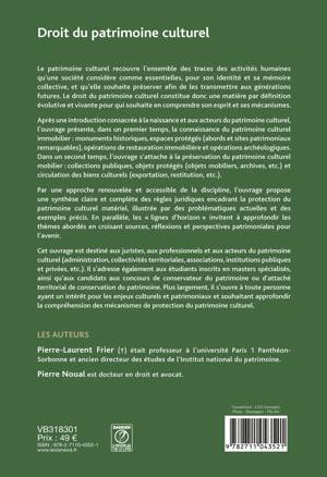 Après une introduction consacrée à la douloureuse naissance du patrimoine culturel, à ses notions dans l'espace et dans le temps, l'ouvrage est structuré entre la protection du patrimoine culturel immobilier (monuments historiques, espaces protégés, fouilles archéologiques) et celle du patrimoine culturel mobilier (collections publiques, musées, archives, circulation et restitution des biens culturels)