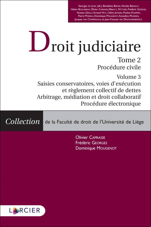 Le troisième volume du présent ouvrage commence par son titre 10, dans lequel Frédéric Georges, étudie les saisies conservatoires, les voies d’exécution et le règlement collectif de dettes. Le premier chapitre est consacré aux notions générales et aux principes applicables à la cinquième partie du Code judiciaire. Ensuite sont exposés les traits communs à toutes les mesures conservatoires. Un troisième chapitre évoque brièvement les différentes saisies conservatoires. De façon symétrique aux mesures conservatoires, les chapitres suivants étudient les traits communs des voies d’exécution et inventorient ces dernières (chap. 4 et 5). Les grandes lignes des procédures de répartition que sont la distribution par contribution et l’ordre sont relatées dans un sixième chapitre. Enfin, le règlement collectif de dettes est traité dans le septième et dernier chapitre du présent titre.