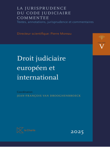 L’objectif général de «La jurisprudence du Code judiciaire commentée» est de traiter, dans l’ordre des dispositions du Code judiciaire, l’état de la jurisprudence assortie de références doctrinales et de brefs commentaires. Le volume V applique ce mode opératoire au droit judiciaire européen et international. Quoiqu’il déborde évidemment le cadre du Code judiciaire, ce volume est indispensable dans la mesure où les précédents ouvrages ne peuvent être consultés qu’en tenant compte de l’européanisation et de l’internationalisation du procès dont les normes ont prévalence sur le droit interne. L’ampleur de cet ouvrage – le plus difficile à élaborer – est révélatrice de l’importance prise par ces normes supra-légales. Dans le prolongement des autres volumes, cet ouvrage fera date par sa qualité, son accessibilité, sa cohérence et par les multiples services qu’il rendra à tous ceux qui le consulteront. Les textes ont été mis à jour jusqu’au 8 janvier 2025. TABLE DES MATIERES . INSTRUMENTS EUROPEENS Directive n° [2003/8/CE] du Conseil du 27 janvier 2003 visant à améliorer l'accès à la justice dans les affaires transfrontalières par l'établissement de règles minimales communes relatives à l'aide judi- ciaire accordée dans le cadre de telles affaires (par E. Leroy, mis à jour par E. Moffa) 3 Règlement (CE) n° 805/2004 du Parlement européen et du Conseil du 21 avril 2004 portant création d'un titre exécutoire européen pour les créances incontestées (par J.-F. van Drooghenbroeck) 31 Règlement (CE) n° 1896/2006 du Parlement européen et du Conseil du 12 décembre 2006 insti- tuant une procédure européenne d'injonction de payer (par A. Berthe) 109 Règlement (CE) n° 861/2007 du Parlement européen et du Conseil du 11 juillet 2007 instituant une procédure européenne de règlement des petits litiges (par A. Berthe) 155 Règlement (CE) n° 4/2009 du Conseil du 18 décembre 2008 relatif à la compétence, la loi ap- plicable, la reconnaissance et l'exécution des décisions et la coopération en matière d'obligations alimentaires (par L. Maistriaux, mis à jour par M. Fanara) 181 Règlement (UE) n° 1215/2012 du Parlement européen et du Conseil du 12 décembre 2012 concernant la compétence judiciaire, la reconnaissance et l'exécution des décisions en matière civile et commerciale (refonte) (dit "Bruxelles Ibis") (par A. Berthe, mis à jour par J. Vanderschuren) 219 Règlement (UE) n° 655/2014 du Parlement européen et du Conseil du 15 mai 2014 portant création d'une procédure d'ordonnance européenne de saisie conservatoire des comptes bancaires, destinée à faciliter le recouvrement transfrontière de créances en matière civile et commerciale (par A. Berthe) 487 Règlement (UE) 2015/848 du Parlement européen et du Conseil du 20 mai 2015 relatif aux pro- cédures d'insolvabilité (refonte) (par P. Wautelet) 515 Règlement (UE) 2019/1111 du Conseil du 25 juin 2019 relatif à la compétence, la reconnaissance et l'exécution des décisions en matière matrimoniale et en matière de responsabilité parentale, ainsi qu'à l'enlèvement international d'enfants (refonte) (dit "Bruxelles IIter") (par A. Ernoux et P. Wautelet) 659 Règlement (UE) 2020/1783 du Parlement européen et du Conseil du 25 novembre 2020 relatif à la coopération entre les juridictions des Etats membres dans le domaine de l'obtention des preuves en matière civile ou commerciale (obtention des preuves) (refonte) (par V. Grella) 743 Règlement (UE) 2020/1784 du Parlement européen et du Conseil du 25 novembre 2020 relatif à la signification et à la notification dans les Etats membres des actes judiciaires et extrajudiciaires en matière civile ou commerciale (signification ou notification des actes) (refonte) (par L. Maistriaux) 771 II. CODE DE DROIT INTERNATIONAL PRIVE Code de droit international privé (L. 16 juillet 2004, M.B. 27.VII.2004) (Extraits: dispositions processuelles) (par P. Wautelet) 825 IXTABLE DES MATIERES Folio III. CONVENTIONS DE LA HAYE Convention relative à la signification et la notification à l'étranger des actes judiciaires et extraju- diciaires en matière civile ou commerciale, faite à La Haye le 15 novembre 1965 (par J. Vander- schuren) 871 Convention sur la reconnaissance et l'exécution des jugements étrangers en matière civile ou com- merciale, faite à La Haye le 2 juillet 2019 (par J. Vanderschuren) 891 IV. DROIT EUROPEEN ET INTERNATIONAL DU PROCES EQUITABLE Convention de sauvegarde des droits de l'homme et des libertés fondamentales, faite à Rome le 4 novembre 1950 (Extrait: art. 6) (par S. van Drooghenbroeck et F. Krenc) 903 Pacte international relatif aux droits civils et politiques, fait à New York le 19 décembre 1966 (Ex- trait: art. 14) (par S. van Drooghenbroeck et F. Krenc) 941 Charte du 12 décembre 2007 des droits fondamentaux de l'Union européenne (Extrait: art. 47) (par S. van Drooghenbroeck et F. Krenc) 949