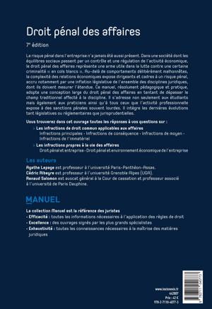 Ce manuel, résolument pédagogique et pratique, propose une conception large du droit pénal des affaires en tentant de dépasser le champ traditionnel affecté à la discipline. Outre l'examen des infractions habituelles, il propose l'étude d'autres incriminations relevant de l'immatériel ou de l'environnement de l'entreprise. Sont ainsi abordés les rapports entre le droit pénal et les créanciers de l'entreprise, le banquier ou encore les consommateurs.