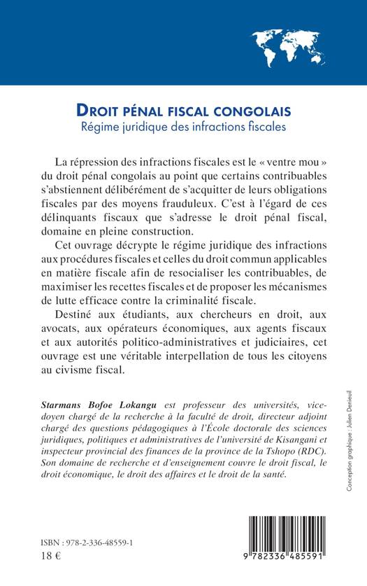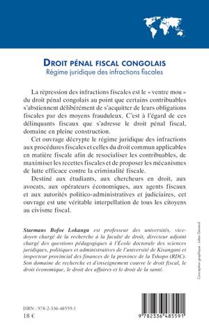 La répression des infractions fiscales est le « ventre mou » du droit pénal congolais au point que certains contribuables s’abstiennent délibérément de s’acquitter de leurs obligations fiscales par des moyens frauduleux. C’est à leur égard de ces délinquants fiscaux que s’adresse le droit pénal fiscal, domaine en pleine construction. Cet ouvrage décrypte le régime juridique des infractions aux procédures fiscales et celles du droit commun applicables en matière fiscale afin de resocialiser les contribuables, de maximiser les recettes fiscales et de proposer les mécanismes de lutte efficace contre la criminalité fiscale. Destiné aux étudiants, aux chercheurs en droit, aux avocats, aux opérateurs économiques, aux agents fiscaux et aux autorités politico-administratives et judiciaires, cet ouvrage est une véritable interpellation de tous les citoyens au civisme fiscal.