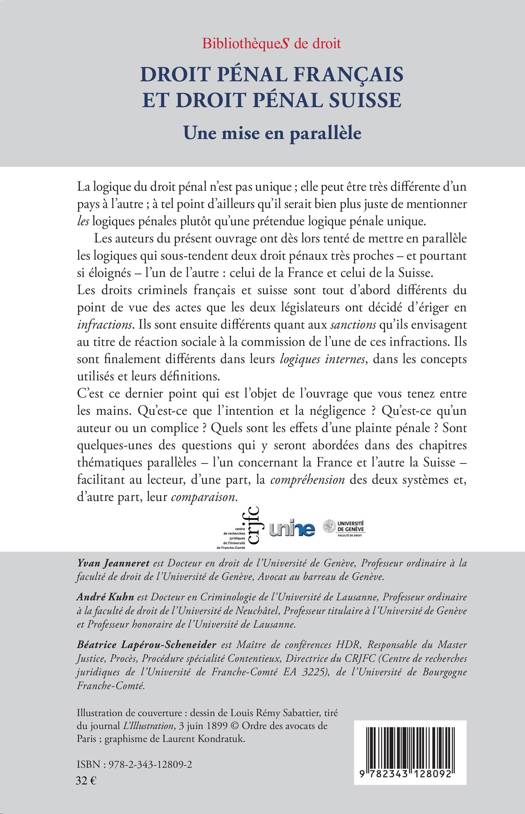 La logique du droit pénal n'est pas unique ; elle peut être très différente d'un pays à l'autre. Le présent ouvrage tente de mettre en parallèle les logiques de deux droits pénaux très proches : celui de la France et celui de la Suisse. Les droits criminels français et suisse sont différents à plusieurs points de vue : celui des actes que les deux législateurs ont érigé en infractions, celui des sanctions envisagées. Enfin, ils diffèrent dans leurs logiques internes, dans les concepts utilisés et leurs définitions. L'étude de ce dernier point est l'objet de cette étude.