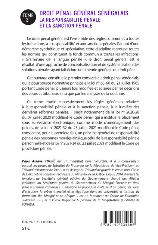 Le droit pénal général est l’ensemble des règles communes à toutes les infractions, à la responsabilité et aux sanctions pénales. Partant d’une démarche synthétique et spéculative, cette discipline regroupe toutes les normes qui constituent le fonds commun à toutes les infractions. « Grammaire de la langue pénale », le droit pénal général est le résultat d’une approche de conceptualisation et de systématisation des solutions pénales ayant fait éclore une théorie générale du droit pénal. Cet ouvrage constitue le premier consacré au droit pénal sénégalais, qui a pour source normative principale la loi n° 65-60 du 21 juillet 1965 portant Code pénal, plusieurs fois modifiée et éclairée par les décisions des cours et tribunaux ainsi que par les analyses de la doctrine. Ce tome étudie successivement les règles générales relatives à la responsabilité pénale et à la sanction pénale, à la lumière des dernières réformes pénales. Il s’agit notamment de la loi n° 2020-28 du 07 juillet 2020 modifiant le Code pénal, qui a institué le placement sous surveillance électronique, comme mode d’aménagement des peines, de la loi n° 2021-32 du 23 juillet 2021 modifiant le Code pénal, consacrant, pour la première fois, un principe général de responsabilité pénale des personnes morales ainsi que celui de la responsabilité pénale personnelle et de la loi n° 2021-34 du 23 juillet 2021 modifiant le Code de procédure pénale.