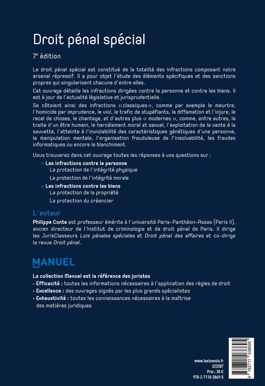 Points forts de l'ouvrage : 1/ Un manuel de référence rédigé par un des plus grands spécialistes du droit pénal. 2/ Un outil pratique qui détaille précisément le droit pénal en matière d'infractions aux biens et à la personne. 3/ Uneédition enrichie et réactualisée.