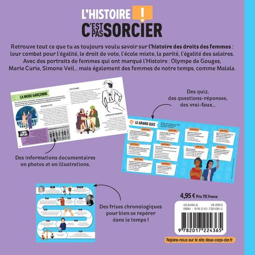 Une première approche ludique et interactive de l’Histoire, pour tout savoir sur l’histoire des droits des femmes : leur combat pour l’égalité, le droit de vote, l’école mixte, la parité, l’égalité des salaires. Des portraits de femmes qui ont marqué l’Histoire : Olympe de Gouges, Marie Curie, Simone Veil… mais également des femmes de notre temps, comme Malala. Avec des informations documentaires en photos et en illustrations, des anecdotes, des quiz et des jeux disséminés au fil des pages, pour apprendre en s’amusant (« vrai ou faux », « trouve l’intrus », « incroyable mais vrai »…). Et des frises chronologiques pour bien se repérer dans le temps !