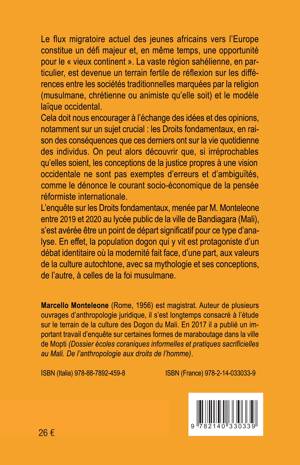 Le flux migratoire actuel des jeunes africains vers l'Europe constitue un défi majeur et, en même temps, une opportunité pour le vieux continent . La vaste région sahélienne, en particulier, est devenue un terrain fertile de réflexion sur les différences entre les sociétés traditionnelles marquées par la religion (musulmane, chrétienne ou animiste qu'elle soit) et le modèle laïque occidental. Cela doit nous encourager à l'échange des idées et des opinions, notamment sur un sujet crucial: les Droits fondamentaux, en raison des conséquences que ces derniers ont sur la vie quotidienne des individus. L'enquête sur les Droits fondamentaux, menée par M. Monteleone entre 2019 et 2020 au lycée public de la ville de Bandiagara (Mali), s'est avérée être un point de départ significatif pour ce type d'analyse. En effet, la population dogon qui y vit est protagoniste d'un débat identitaire où la modernité fait face, d'une part, aux valeurs de la culture autochtone, avec sa mythologie et ses conceptions, de l'autre, à celles de la foi musulmane.
