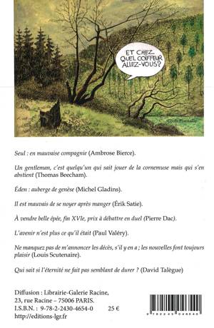 Doit-on présenter Voltaire, le plus grand écrivain de son temps, selon Goethe, le « Français suprême » ? Evoque-t-on Rabelais —, dont la langue, archaïque et moderne, est pavoisée des savoirs de l’époque —, Cervantès ou Carroll, en doutant qu’ils irriguent la culture universelle ? A-t-on jamais été confronté à l’humour involontaire de Balzac (la naïveté : souplesse ou rigidité ?) ou à celui, dédaigneux, de Mallarmé ? N’avons-nous pas relégué un peu vite Swift, Hoffmann, Andersen, Lear, La Bruyère, Hugo, Supervielle, Lautréamont, Anatole France, Villiers de L’Isle-Adam, Jean Richepin et un certain Flaubert à nos heures d’apprentissage ? Et que penser de JB Morton, Marcel Schwob, Pierre Dac, Alphonse Allais, Henri Michaux, Jules Renard, Émile Ajar, Chaval, René de Obaldia, Jean Cocteau, André Frédérique, Gaston Chaissac… ou, plus près de nous, Jacques Henri Pons, Paul Vincensini, Pierre Chabert, Topor, René de Obaldia, Guy Foissy, Patrick Ravella, César Capoulet, William G. Connaught, Thomas Turnedfish, Sam Tapomon, Marc Matthieu, Hubert Cesta…, ces spécialistes de l’expression « vive et drue » ? Des pensées d’humour (ou aphorismes) accompagnent les textes présents dans ces pages. Nombre d’entre elles sont inédites, les autres nous ont semblé relever du meilleur du genre. Soit la diversité contre la monotonie, et le génie de la fantaisie contre l’uniformité, car, comme le professe l’un de nos invités et penseur éminent, Jean-Baptiste Clarindon, « la connaissance suprême passe par des assimilations mémorielles aiguës (expériences limites), au premier rang desquelles il convient de placer la soupe aux champignons et le lapin au vin blanc ».