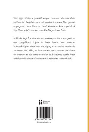 In 'Druks' legt Francien uit wat AD(H)D precies is en geeft ze een ongefilterd kijkje in haar leven. Van waarom boodschappen doen een uitdaging is en welke medicatie ze (soms niet) slikt, tot hoe AD(H)D werkt tussen de lakens en waarom ze op kantoor onder de brandtrap werkt. Voor iedereen die direct of indirect met AD(H)D te maken heeft.