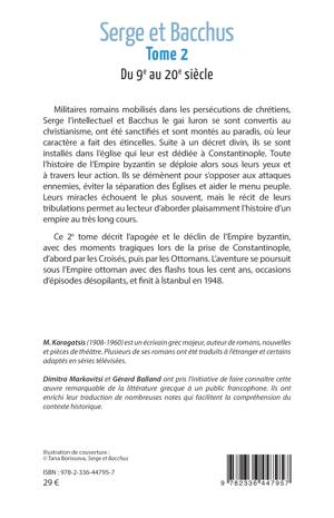 Militaires romains mobilisés dans les persécutions de chrétiens, Serge l’intellectuel et Bacchus le gai luron se sont convertis au christianisme, ont été sanctifiés et sont montés au paradis, où leur caractère a fait des étincelles. Suite à un décret divin, ils se sont installés dans l’église qui leur est dédiée à Constantinople. Toute l’histoire de l’Empire byzantin se déploie alors sous leurs yeux et à travers leur action. Ils se démènent pour s’opposer aux attaques ennemies, éviter la séparation des Églises et aider le menu peuple. Leurs miracles échouent le plus souvent, mais le récit de leurs tribulations permet au lecteur d’aborder plaisamment l’histoire d’un empire au très long cours. Ce 2e tome décrit l’apogée et le déclin de l’Empire byzantin, avec des moments tragiques lors de la prise de Constantinople, d’abord par les Croisés, puis par les Ottomans. L’aventure se poursuit sous l’Empire ottoman avec des flashs tous les cent ans, occasions d’épisodes désopilants, et finit à Istanbul en 1948.