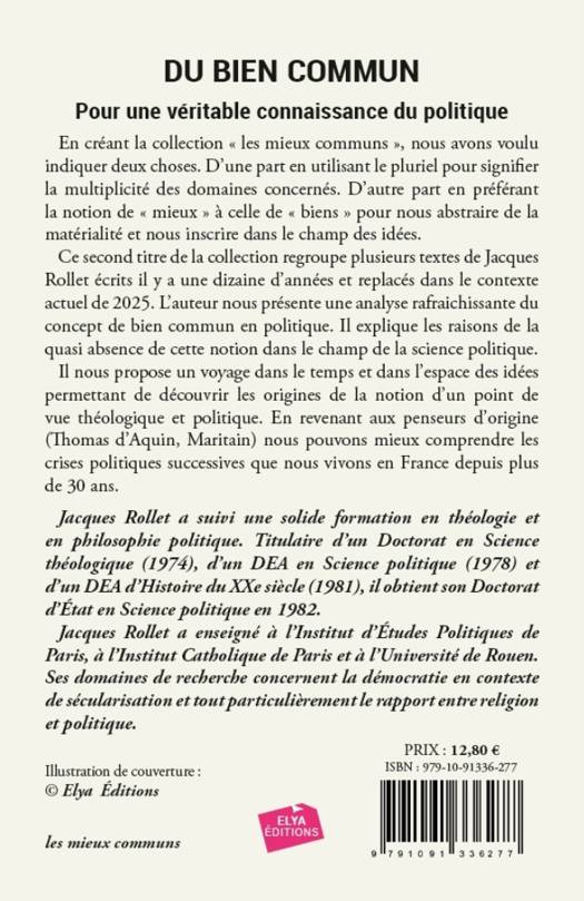 En créant la collection « les mieux communs », nous avons voulu indiquer deux choses. D’une part en utilisant le pluriel pour signifier la multiplicité des domaines concernés. D’autre part en préférant la notion de « mieux » à celle de « biens » pour nous abstraire de la matérialité et nous inscrire dans le champ des idées. Ce second titre de la collection regroupe plusieurs textes de Jacques Rollet écrits il y a une dizaine d’années et replacés dans le contexte actuel de 2025. L’auteur nous présente une analyse rafraichissante du concept de bien commun en politique. Il explique les raisons de la quasi absence de cette notion dans le champ de la science politique. Il nous propose un voyage dans le temps et dans l’espace des idées permettant de découvrir les origines de la notion d’un point de vue théologique et politique. En revenant aux penseurs d’origine (Thomas d’Aquin, Maritain) nous pouvons mieux comprendre les crises politiques successives que nous vivons en France depuis plus de 30 ans.