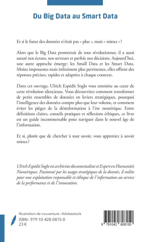 Et si le futur des données n'était pas plus , mais mieux ? Alors que le Big Data promettait de tout révolutionner, il a aussi saturé nos écrans, nos serveurs et parfois nos décisions. Aujourd'hui, une autre approche émerge les Small Data et les Smart Data. Moins imposantes mais infiniment plus pertinentes, elles offrent des réponses précises, rapides et adaptées à chaque contexte. Dans cet ouvrage, Ulrich Espédit Soglo vous emmène au coeur de cette révolution silencieuse. Vous découvrirez comment transformer de petits ensembles de données en leviers stratégiques, pourquoi l'intelligence des données compte plus que leur volume, et comment éviter les pièges de la désinformation à l'ère numérique. Entre définitions claires, conseils pratiques et réflexions éthiques, ce livre est un guide incontournable pour naviguer dans le nouvel âge de l'information. Et si, plutôt que de chercher à tout savoir, vous appreniez à savoir mieux ?