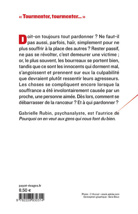 Doit-on toujours tout pardonner ? Ne faut-il pas aussi, parfois, haïr, simplement pour ne plus souffrir à la place des autres ? Rester passif, ne pas se révolter, c'est demeurer une victime; or, le plus souvent, les bourreaux se portent bien, tandis que ce sont les innocents qui dorment mal, s'angoissent et prennent sur eux la culpabilité que devraient plutôt ressentir leurs agresseurs. Les choses se compliquent encore lorsque la souffrance a été involontairement causée par un proche, une personne aimée. Dès lors, comment se débarrasser de la rancoeur ? Et à qui pardonner ?