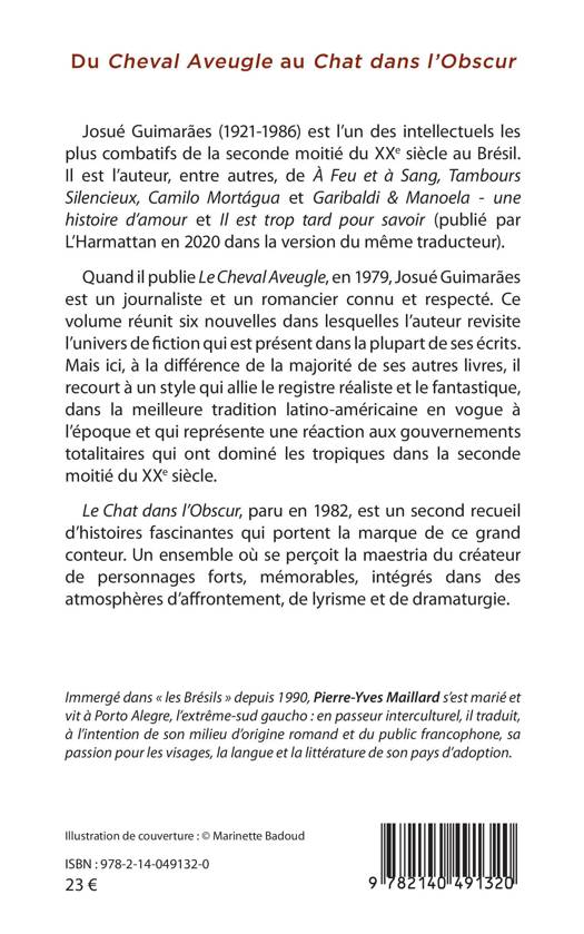 Josué Guimarães (1921-1986) est l'un des intellectuels les plus combatifs de la seconde moitié du XXe siècle au Brésil. Il est l'auteur, entre autres, de À Feu et à Sang, Tambours Silencieux, Camilo Mortágua et Garibaldi & Manoela - une histoire d'amour et Il est trop tard pour savoir (publié par L'Harmattan en 2020 dans la version du même traducteur). Quand il publie Le Cheval Aveugle, en 1979, Josué Guimarães est un journaliste et un romancier connu et respecté. Ce volume réunit six nouvelles dans lesquelles l'auteur revisite l'univers de fiction qui est présent dans la plupart de ses écrits. Mais ici, à la différence de la majorité de ses autres livres, il recourt à un style qui allie le registre réaliste et le fantastique, dans la meilleure tradition latino-américaine en vogue à l'époque et qui représente une réaction aux gouvernements totalitaires qui ont dominé les tropiques dans la seconde moitié du XXe siècle. Le Chat dans l'Obscur, paru en 1982, est un second recueil d'histoires fascinantes qui portent la marque de ce grand conteur. Un ensemble où se perçoit la maestria du créateur de personnages forts, mémorables, intégrés dans des atmosphères d'affrontement, de lyrisme et de dramaturgie.