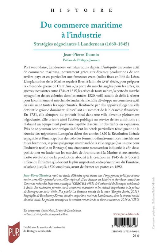 Port secondaire, Landerneau est néanmoins depuis l’Antiquité un centre actif de commerce maritime, notamment grâce aux diverses productions de son arrière-pays et en particulier aux fameuses crées (toiles fines en lin) du Léon. L’implantation de la Marine royale à Brest à la fin du XVIIe siècle, pour préparer la « Seconde guerre de Cent Ans », la perte du marché anglais pour les crées, les guerres incessantes entre 1744 et 1815, les crises de toute nature, la perte du marché espagnol et de ses colonies dans les années 1820, voilà autant de défis à relever pour la communauté marchande landernéenne. Elle développe un commerce actif en saisissant toutes les opportunités. Renforcée par des apports allogènes, elle devient le groupe dominant, s’installant au sommet de la hiérarchie financière. En 1721, elle s’empare du pouvoir local dans une ville devenue pleinement négociante. Elle oriente ainsi l’action publique au service de ses ambitions en réalisant un équipement portuaire capable d’accueillir des trafics en expansion. Près de ce poumon économique s’édifient les hôtels particuliers témoignant de la réussite des négociants. Lorsqu’au début des années 1820 la Révolution libérale espagnole et l’émancipation des colonies ferment définitivement ces marchés aux toiles bretonnes, le principal groupe marchand de la ville engage (cas unique pour l’industrie textile en Bretagne) une étonnante reconversion industrielle afin de se positionner en leader sur les marchés de fournitures à la Marine et aux armées. Cette révolution de la production aboutit à la création en 1845 de la Société linière du Finistère qui devient la plus importante entreprise privée du Finistère, salariant jusqu’à 4 500 employés, avant de fermer ses portes en 1892.