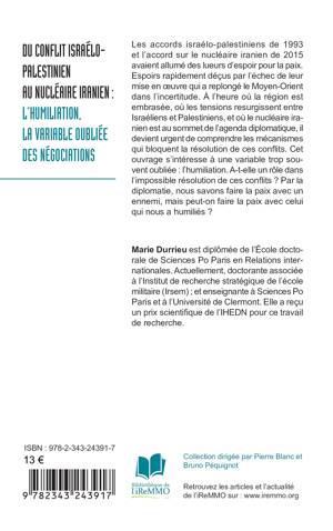Les accords israélo-palestiniens de 1993 et l'accord sur le nucléaire iranien de 2015 représentaient un espoir pour la paix, rapidement déçu par l'échec de leur mise en oeuvre qui a replongé le Moyen-Orient dans l'incertitude. À l'heure où la région est embrasée, où les tensions resurgissent, et où le nucléaire iranien est au sommet de l'agenda diplomatique, il devient urgent de comprendre les mécanismes qui bloquent la résolution de ces conflits. Cet ouvrage s'intéresse à une variable trop souvent oubliée: l'humiliation. A-t-elle un rôle dans l'impossible résolution de ces conflits ? Par la diplomatie, nous savons faire la paix avec un ennemi, mais peut-on faire la paix avec celui qui nous a humiliés ?