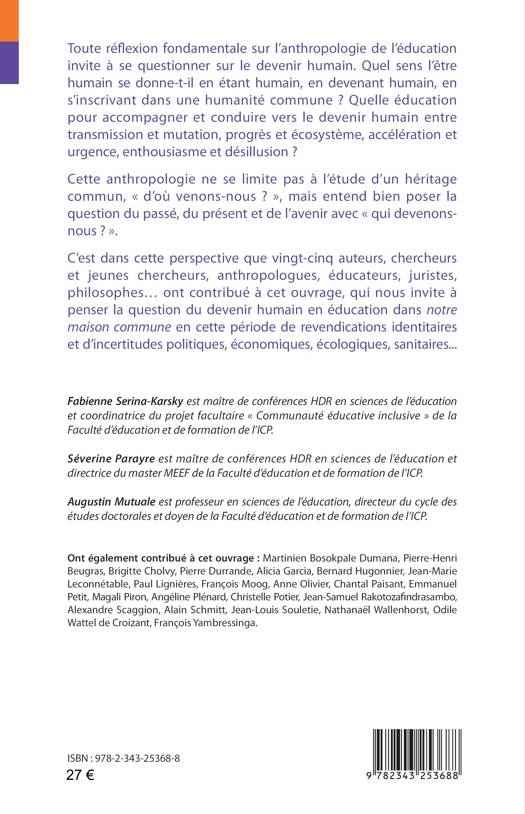 Toute réflexion fondamentale sur l’anthropologie de l’éducation invite à se questionner sur le devenir humain. Quel sens l’être humain se donne-t-il en étant humain, en devenant humain, en s’inscrivant dans une humanité commune ? Quelle éducation pour accompagner et conduire vers le devenir humain entre transmission et mutation, progrès et écosystème, accélération et urgence, enthousiasme et désillusion ? Cette anthropologie ne se limite pas à l’étude d’un héritage commun, « d’où venons-nous ? », mais entend bien poser la question du passé, du présent et de l’avenir avec « qui devenons-nous ? ». C’est dans cette perspective que vingt-cinq auteurs, chercheurs et jeunes chercheurs, anthropologues, éducateurs, juristes, philosophes... ont contribué à cet ouvrage, qui nous invite à penser la question du devenir humain en éducation dans notre maison commune en cette période de revendications identitaires et d’incertitudes politiques, économiques, écologiques, sanitaires..