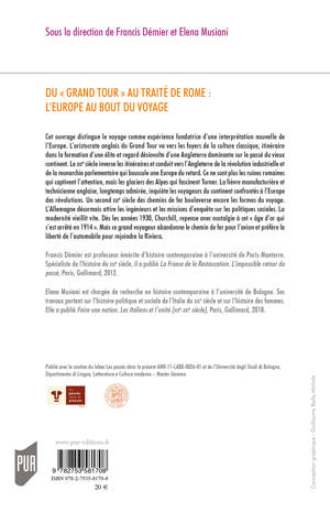 Cet ouvrage distingue le voyage comme expérience fondatrice d’une interprétation nouvelle de l’Europe. De l’aristocrate anglais du Grand Tour qui va vers les foyers de la culture classique au continental attiré vers l’Angleterre de la révolution industrielle puis vers l’Allemagne des ingénieurs, chacun tire de son voyage une image de l’Europe qui le conforte ou qui entre en dissonance avec le passé. Au fil des itinéraires de ces Européens se construit une mémoire du continent.