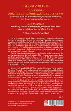 Les trois opuscules réunis dans ce volume concernent les sciences de la terre. Le plus célèbre, Du monde, centré sur l'organisation du cosmos, se présente sous la forme d'une lettre à Alexandre, sans doute le roi de Macédoine. L'authenticité de ce texte a depuis longtemps été mise en cause par nombre de spécialistes, mais l'agitation savante ressurgie dans les années 1970 lui a fait gagner en notoriété. Le traité sur les vents, bref fragment conservé de l'abondante littérature anémologique des Grecs, est lui aussi pseudo-aristotélicien.
