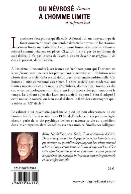 Le cabinet d’un psychiatre-psychanalyste est un bon observatoire de cet homme limite : de la secrétaire au PDG, de l’adolescent à la personne âgée, chacun parle de sa vie psychique intime et raconte sa vie au quotidien, dans les entreprises, dans les écoles, avec ses amis, sa famille, ses collègues.