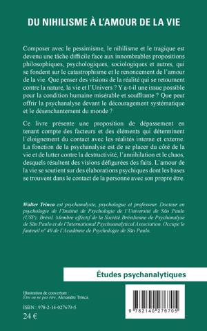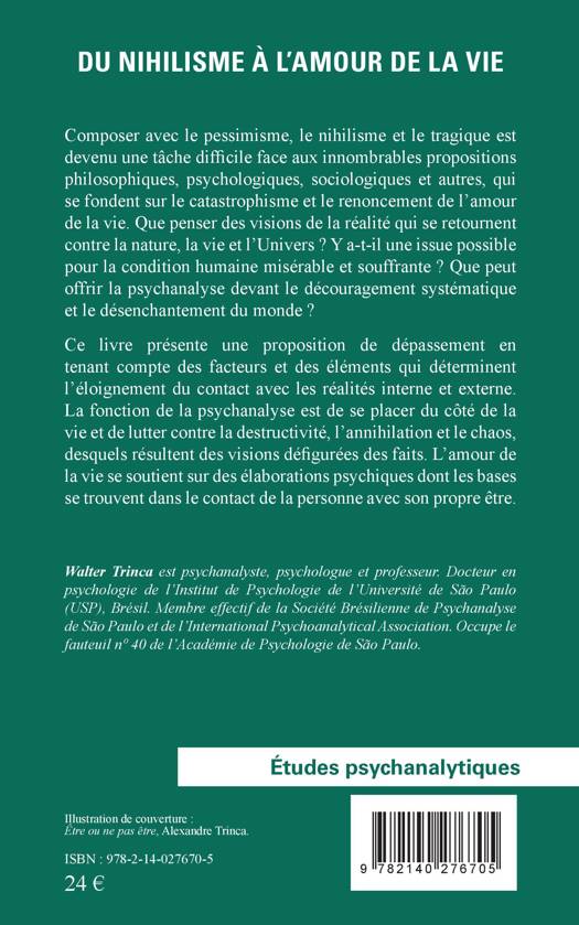 Composer avec le pessimisme, le nihilisme et le tragique est devenu une tâche difficile face aux innombrables propositions philosophiques, psychologiques, sociologiques et autres, qui se fondent sur le catastrophisme et le renoncement de l'amour de la vie. Que penser des visions de la réalité qui se retournent contre la nature, la vie et l'Univers ? Y a-t-il une issue possible pour la condition humaine misérable et souffrante ? Que peut offrir la psychanalyse devant le découragement systématique et le désenchantement du monde ? Ce livre présente une proposition de dépassement en tenant compte des facteurs et des éléments qui déterminent l'éloignement du contact avec les réalités interne et externe. La fonction de la psychanalyse est de se placer du côté de la vie et de lutter contre la destructivité, l'annihilation et le chaos, desquels résultent des visions défigurées des faits. L'amour de la vie se soutient sur des élaborations psychiques dont les bases se trouvent dans le contact de la personne avec son propre être.